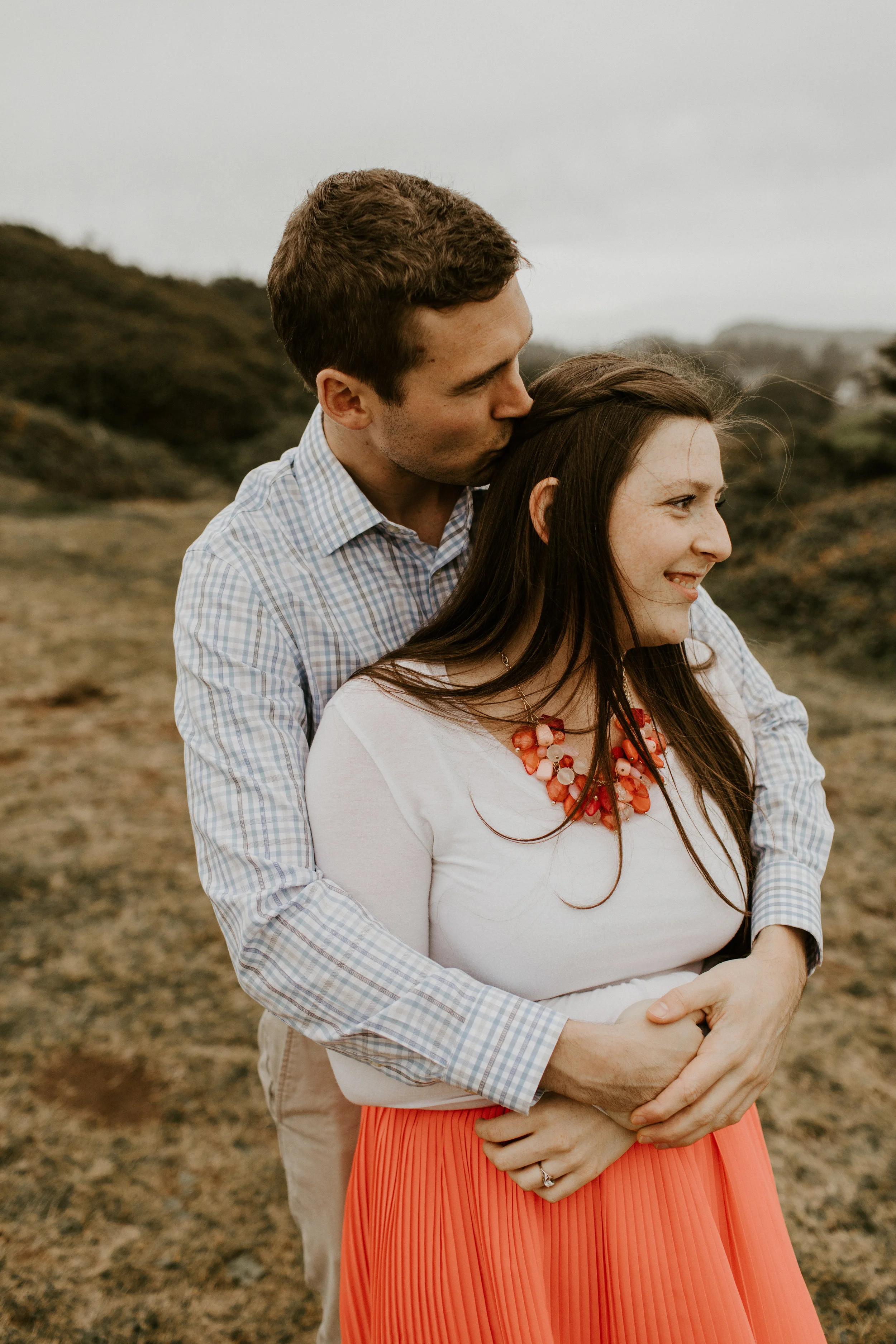 I suggested Fishing Rock as a location because it is full of memories for me. The place is just beautiful. You walk down a green and shaded path, passing gorgeous trees and bushes as you anticipate the view ahead. The trademark Oregon Coast foliage opens up as you see the first glimpse of the ocean ahead. You wind down the path, glimpses of water, interesting trees, and gorgeous coastline.
